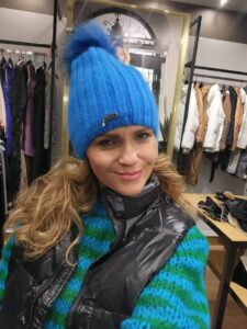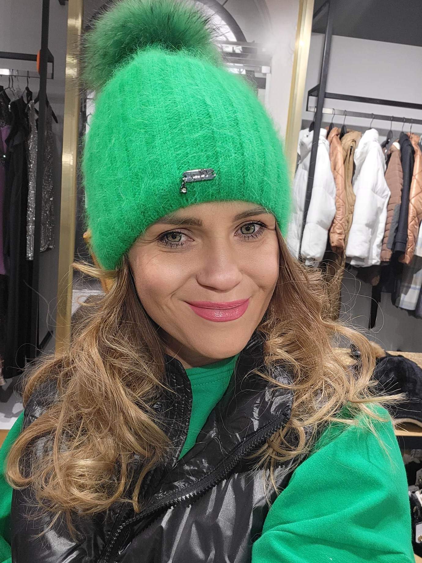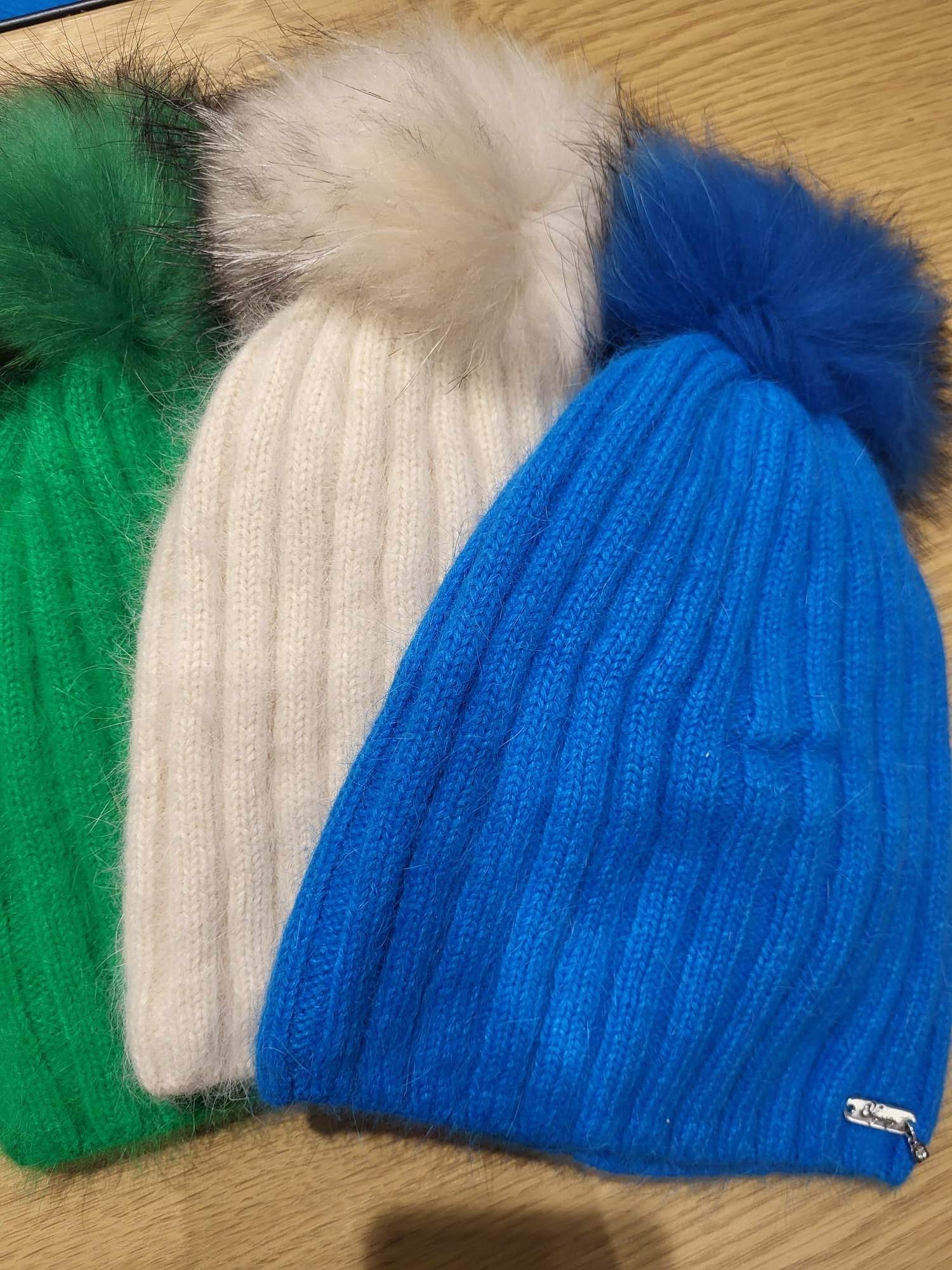 Czapka z angory z pomponem. Środek czapki jest dodatkowo obszyty polarem dlatego nie czujemy dyskomfortu. Również kolory zielone, beżowe.