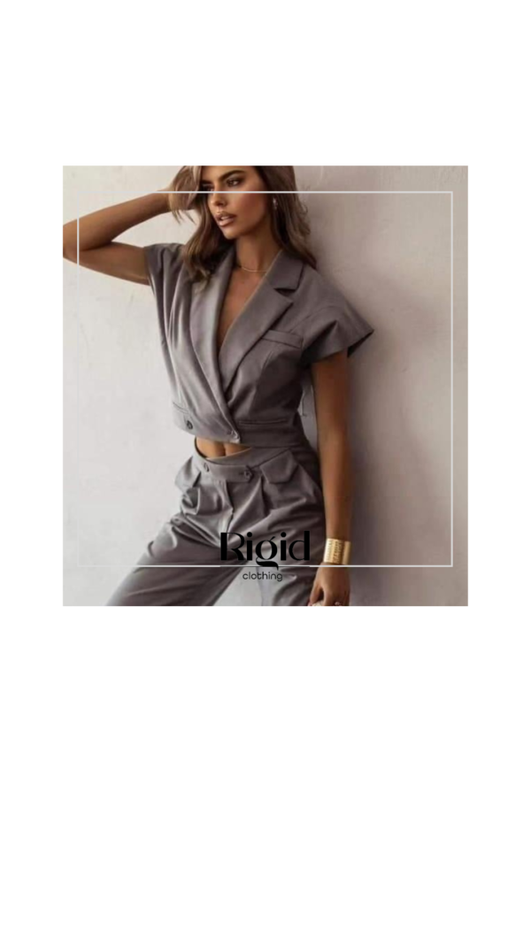 Komplet zawiera szerokie spodnie z kieszeniami, efektowne zakładki które dodają uroku, kamizelka zapinana na dole na wysokości pasa na guziki, kołnierz wydłuża sylwetkę. Elegancka szarość pasuje zarówno do biura jak i na spotkanie biznesowe.