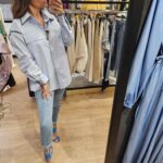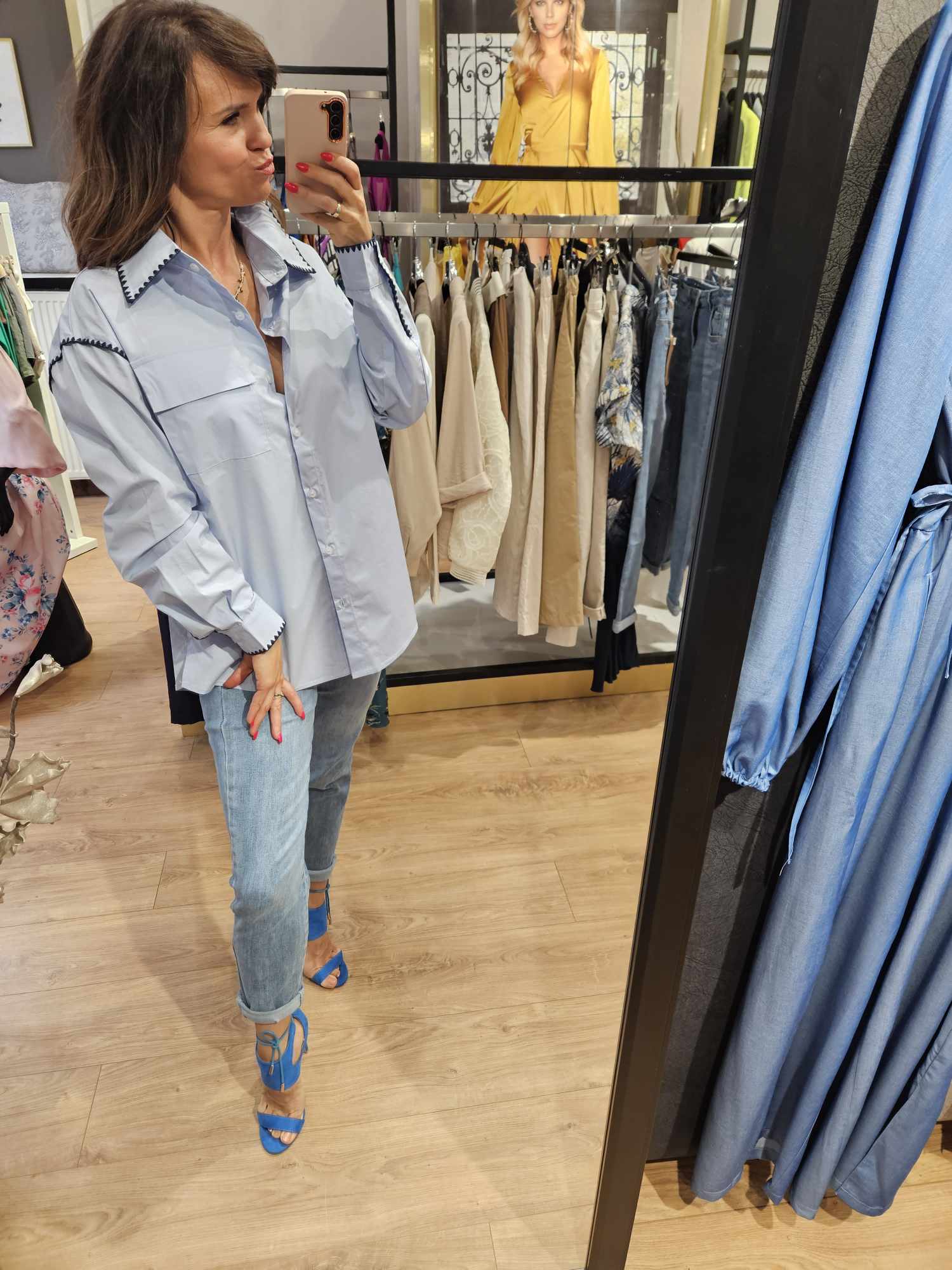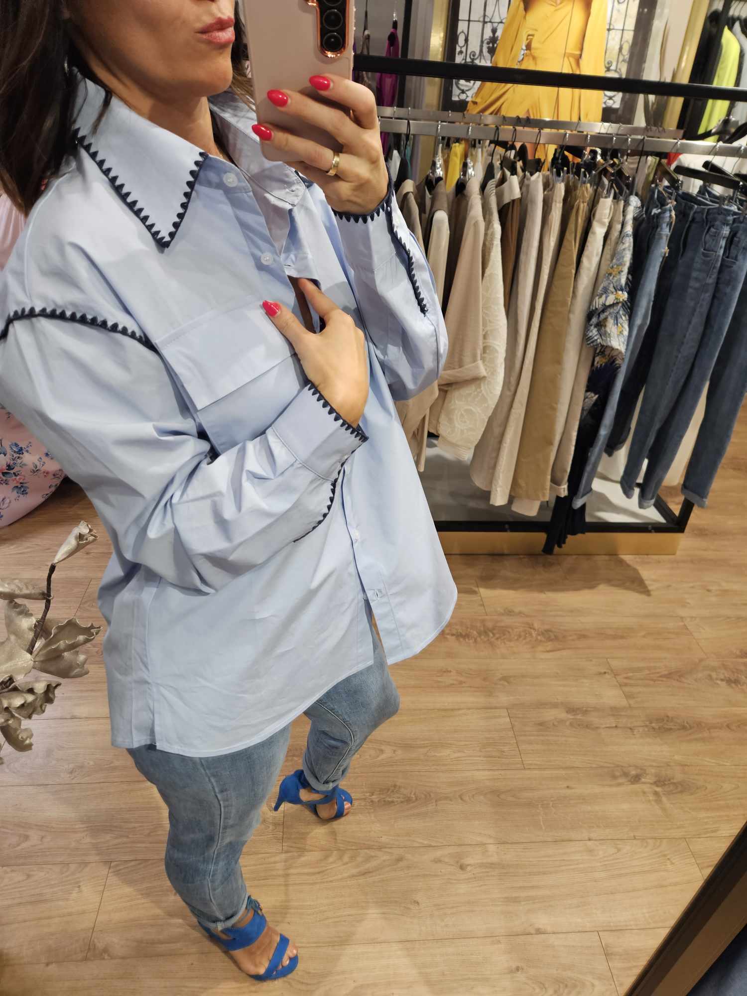 Niebieska koszula bawełniana z pięknym dekoracyjnymi haftem w kolorze granatu na mankietach, ramieniu i kołnierzyku. Rozmiar M/L. Skład 100% bawełna.